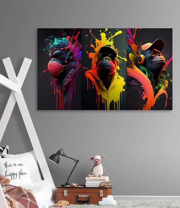 25.01 €15.00 €Canvas Schilderijen Een collage van afbeeldingen van een aap met kleurrijke verfspatten