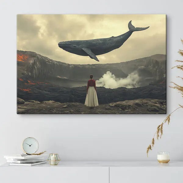 25.01 €15.00 €Canvas Schilderijen Vrouw kijkt naar een walvis die over een vulkaan vliegt