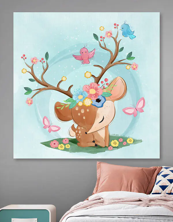 30.01 €18.00 €Canvas Schilderijen Een cartoon hert met bloemen en vogels
