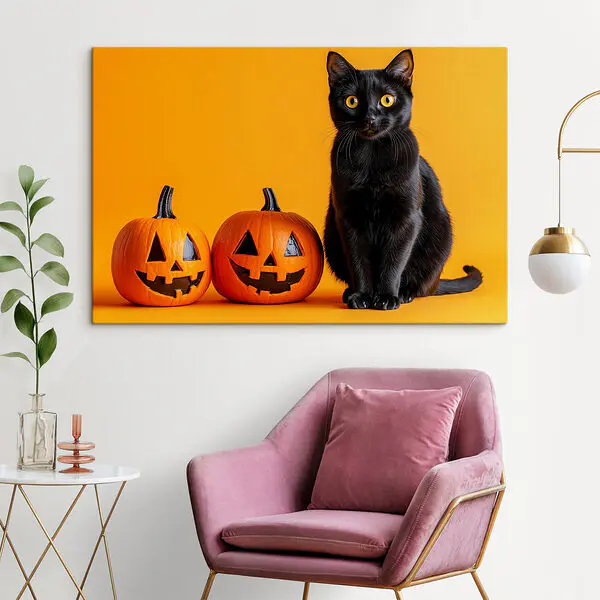 25.01 €15.00 €Canvas Schilderijen Zwarte kat zittend naast twee gesneden pompoenen