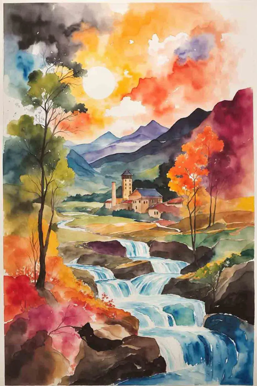 25.01 €15.00 €Canvas Schilderijen Aquarel van bomen en bergen