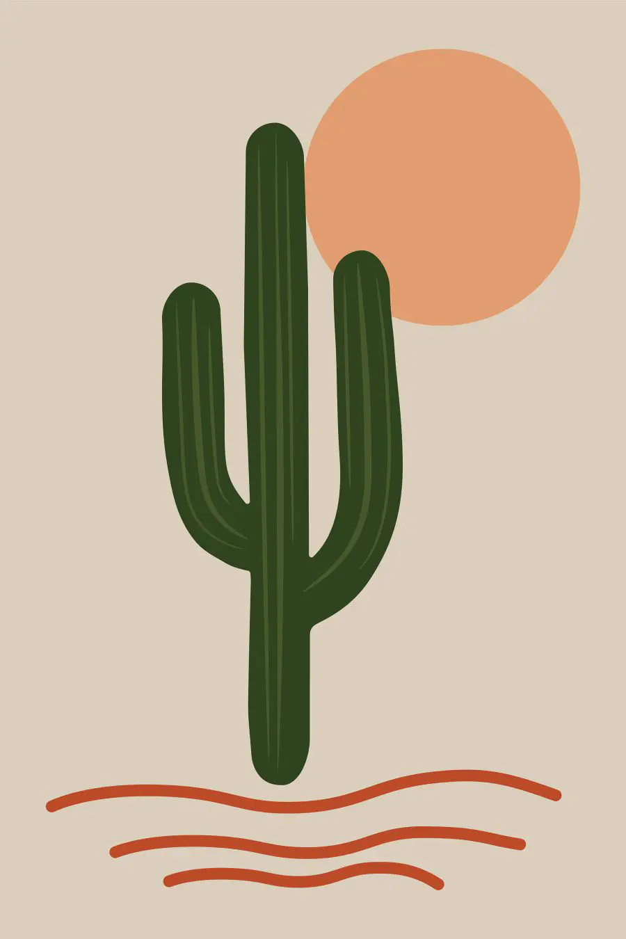 Stel je voor dat je door een zonovergoten woestijn wandelt zonder de hitte - klinkt leuk, toch? Dat is de sfeer die je krijgt met dit doek "Cactus met de zon erachter". Een opvallend cactussilhouet gekust door een warme, gloeiende zon. Het is alsof je een stukje serene buitenlucht in huis haalt. Perfect voor natuurliefhebbers of iedereen die een vleugje van het onverwachte wil. Zie het al in je woonkamer staan, om spontane gesprekken op gang te brengen. Het is warm, uitnodigend en een tikkeltje grillig. Een ontsnapping uit de woestijn zonder zand in je schoenen!
