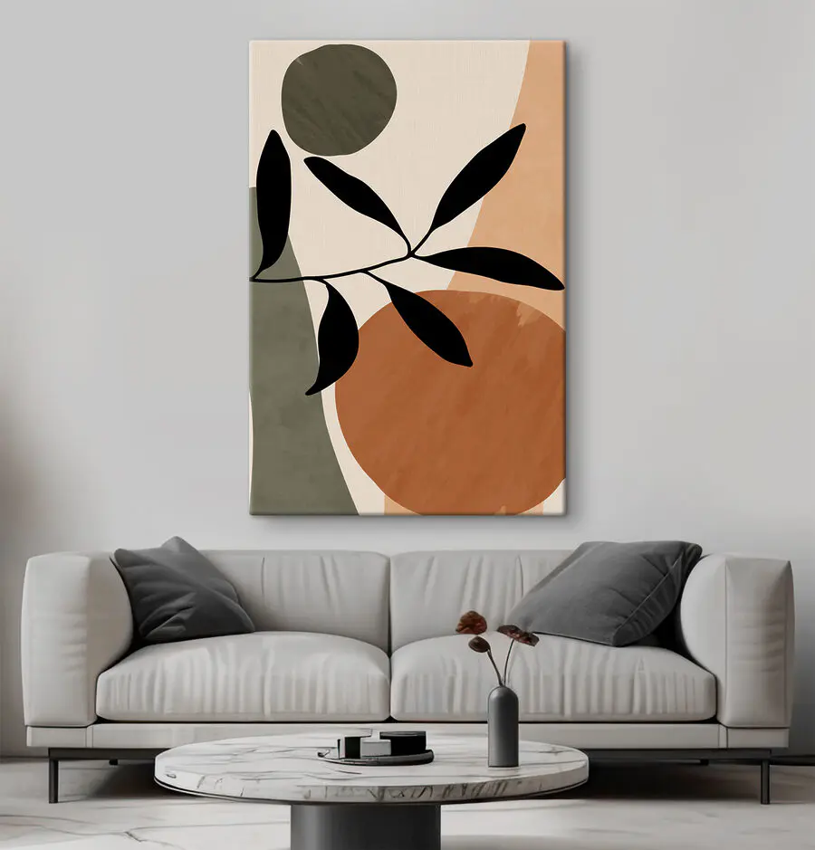 Canvas Schilderijen Een zwart blad aan een tak met cirkels en cirkels