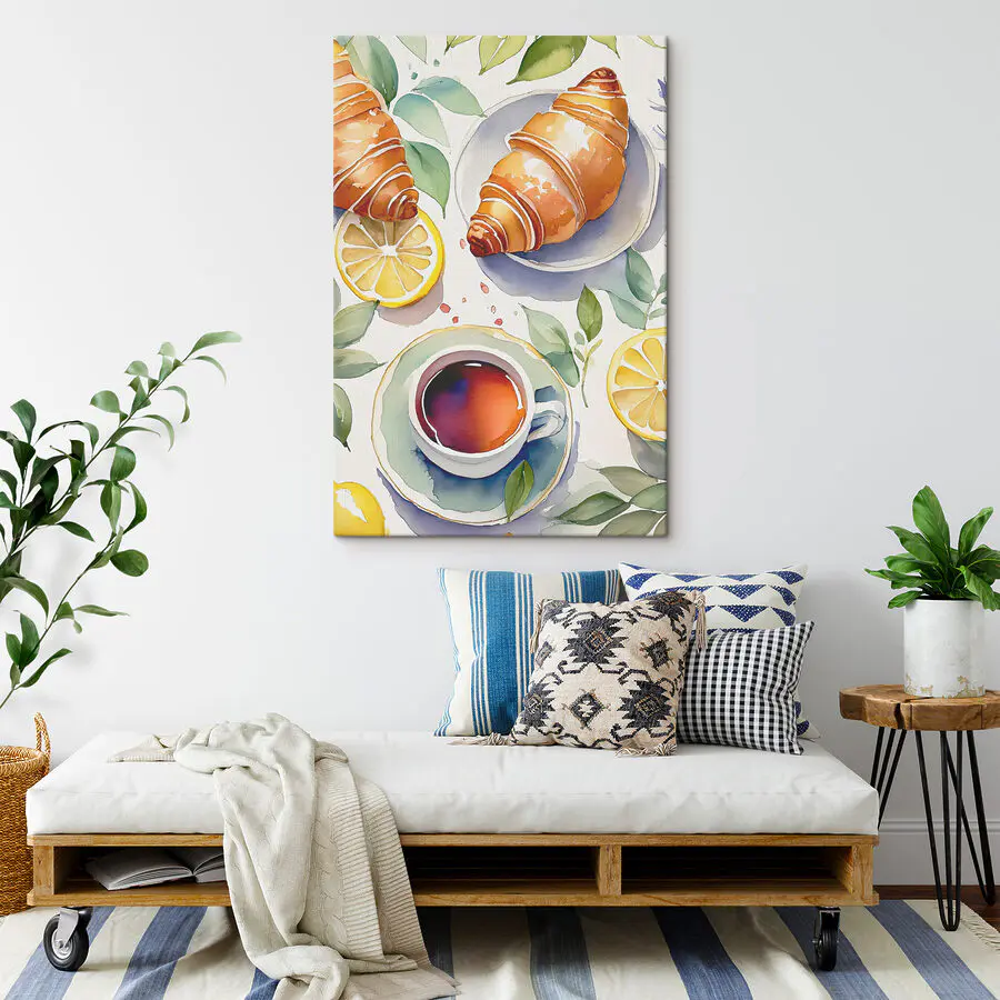 Canvas Schilderijen Aquarel van een croissant en een kopje thee
