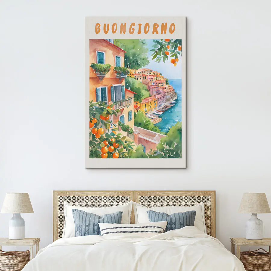 25.01 €15.00 €Canvas Schilderijen Aquarel van gebouwen en citroenen op een zonnige dag