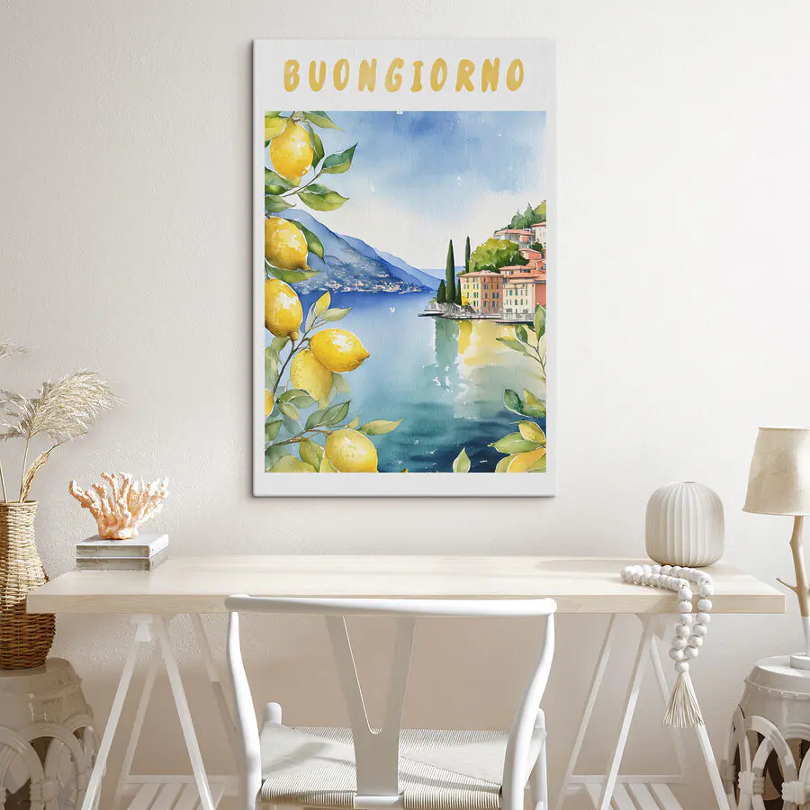 25.92 €14.25 €Canvas Schilderijen Aquarel van gebouwen en citroenen op een zonnige dag