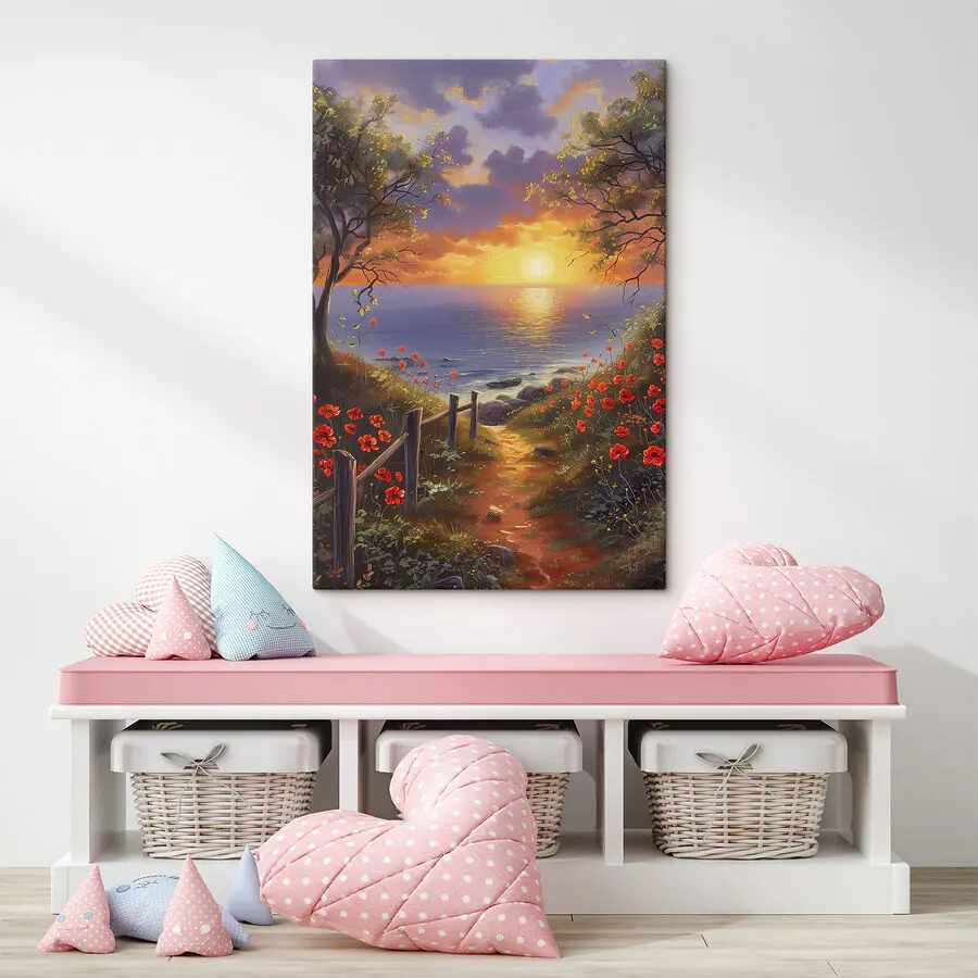 Stel je voor dat deze prachtige canvasprint in je woonkamer hangt - een vleugje rust aan je muur. Dit stuk toont een charmant pad dat naar serene wateren leidt, bezaaid met levendige bloemen die zoete woordjes fluisteren. Je kunt de koele bries van het water en het zachte gekraak van het pad onder je voeten bijna voelen. Het is alsof je je eigen privé ontsnapping binnenstapt, zonder je bank te verlaten. Perfect voor die dagen dat je een mentale vakantie nodig hebt of gewoon een vleugje magie van de natuur binnenshuis. Het is niet zomaar een kunstwerk; het is een klein moment van zen, een zacht duwtje in de rug om te vertragen en wat dieper adem te halen. Geweldig voor iedereen die houdt van uitzicht op zee, bloemen of gewoon een prachtig stuk dat uitnodigt om nog eens te kijken. Stel je voor: tot rust komen na een lange dag, je ogen laten afdrijven naar die stralende zonsondergang op het water en je een beetje lichter voelen. Sommigen zeggen dat kunst een ruimte niet kan transformeren, maar deze print zou daar tegenin gaan.