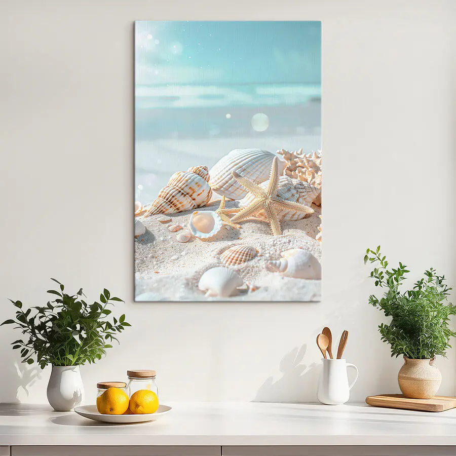 Canvas Schilderijen Een groep schelpen en zeesterren op zand