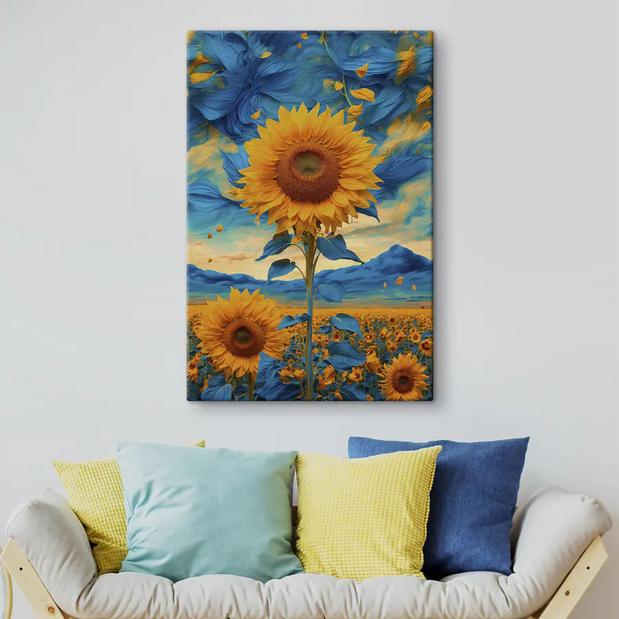 Canvas Schilderijen Zonnebloem met blauwe en gele bladeren