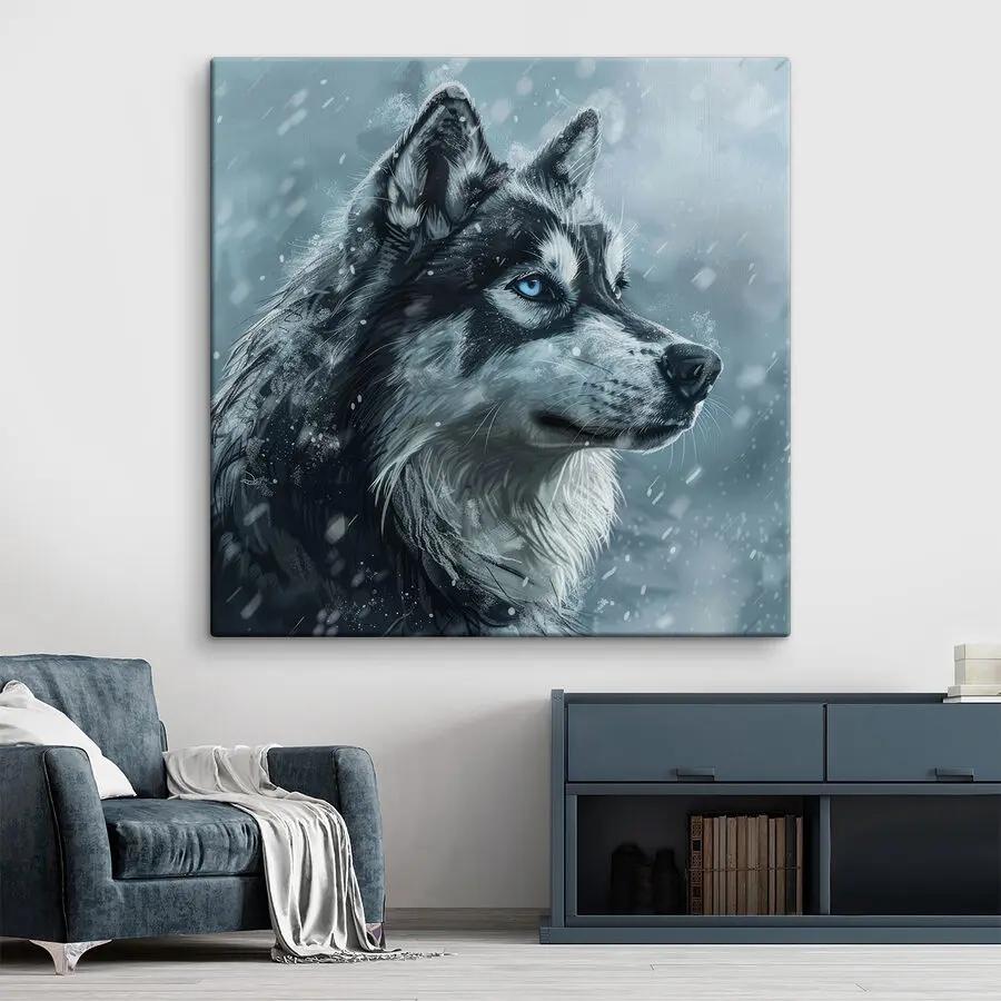 Ooit gedacht aan een stukje winterlandschap in je woonkamer? "Dog in the Snow" brengt die koele, frisse sfeer in je kamer. Kijk eens naar die doordringende blauwe ogen en de zachte, bijna tastbare vacht! Het is alsof je naar een ijzige scène uit een ver Scandinavisch bos staart. Deze canvasprint is perfect voor zowel dieren- als natuurliefhebbers. Als je dit aan je muur hangt, kan het je dat verfrissende, bijna kille gevoel geven op een warme middag - als een visueel zuchtje frisse lucht. Denk je dat dit net dat vleugje serene majesteit is dat je inrichting nodig heeft? Helemaal. Maak het je gemakkelijk, pak een warme chocolademelk en laat dit prachtige stuk je meevoeren naar een besneeuwde ontsnapping, gewoon vanuit je luie stoel.