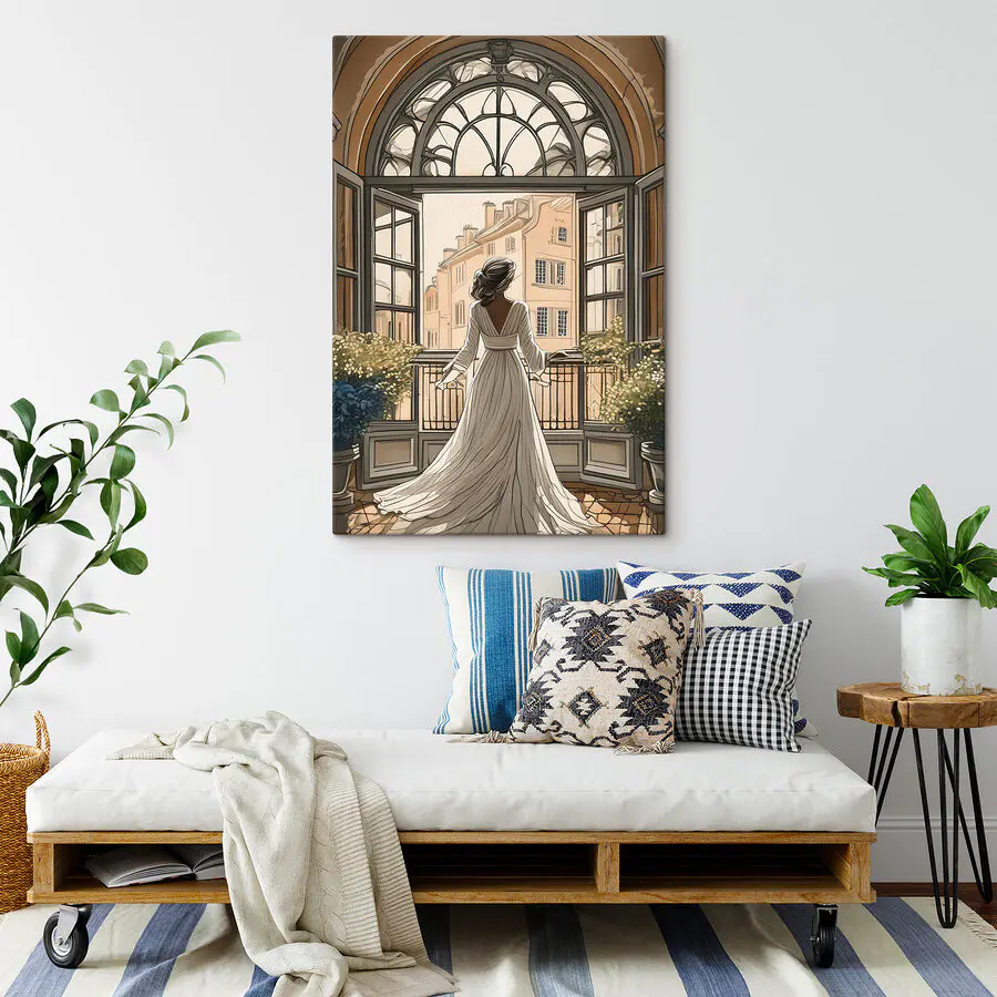 Canvas Schilderijen Vrouw in een witte jurk kijkt uit een raam