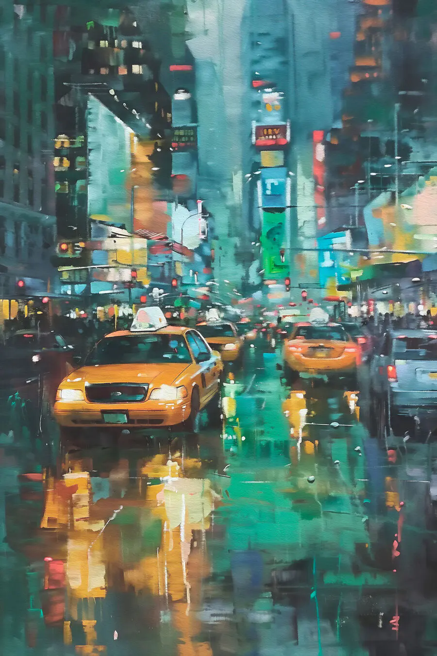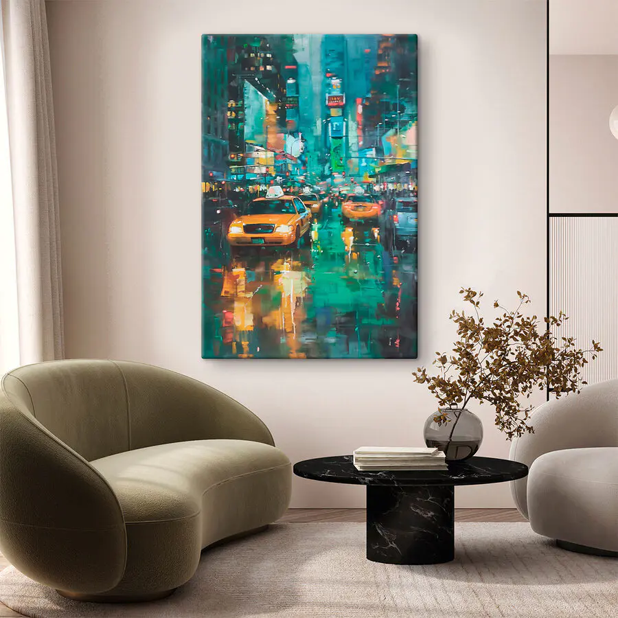 Canvas Schilderijen Gele taxi’s op een natte straat