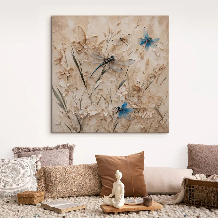 Canvas Schilderijen Libellen en bloemen op een muur