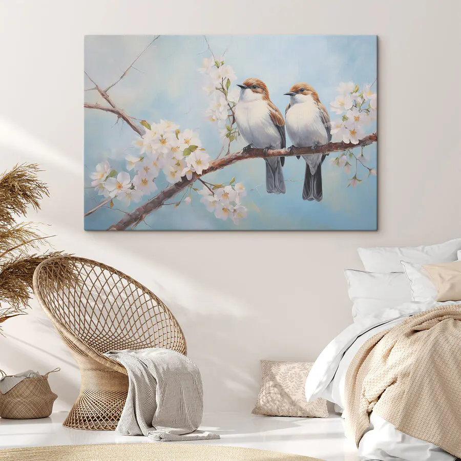 Canvas Schilderijen Twee vogels op een tak met witte bloemen