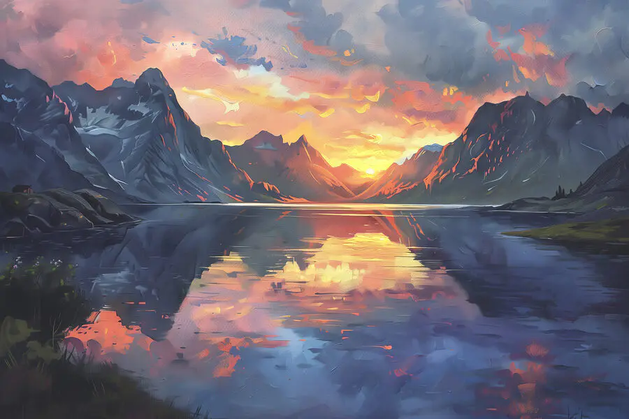 25.92 €14.25 €Canvas Schilderijen Aquarel van een meer met bergen in de verte