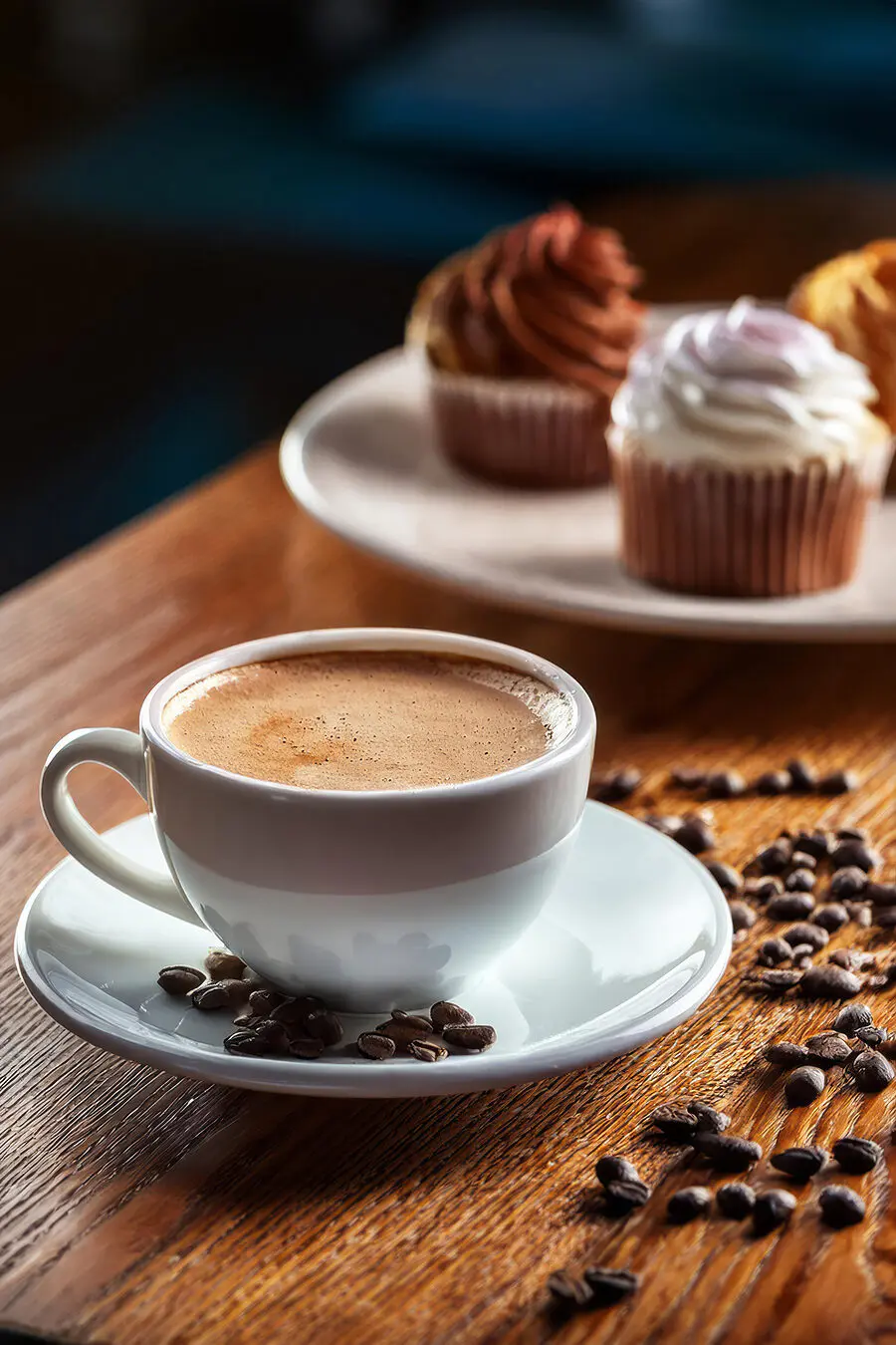 Canvas Schilderijen Kopje koffie en cupcakes op een tafel