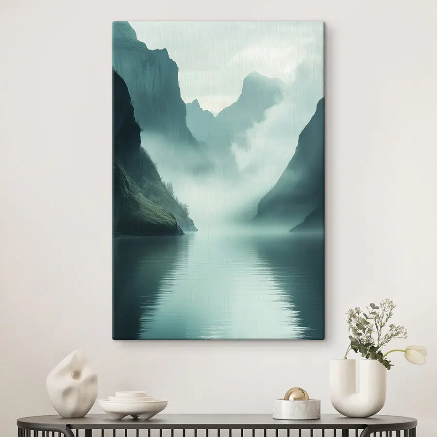 Stel je deze serene canvasprint voor in je kamer - het is als een zachte knuffel voor je ogen. Het water weerspiegelt majestueuze bergen, gehuld in dromerige mist. Het fluistert over avonturen die nog moeten komen, of misschien momenten van gezellige contemplatie. Stel je voor dat je geniet van een kopje koffie terwijl je naar dit rustige tafereel staart en stress laat wegdrijven als een blad op het water. Perfect voor elke kamer, het voegt een verfrissend vleugje natuur toe zonder modder op je laarzen. Het herinnert je eraan dat vrede slechts een oogopslag van je verwijderd kan zijn, aan je muur. Waarom breng je niet een stukje van het buitenleven mee naar binnen?