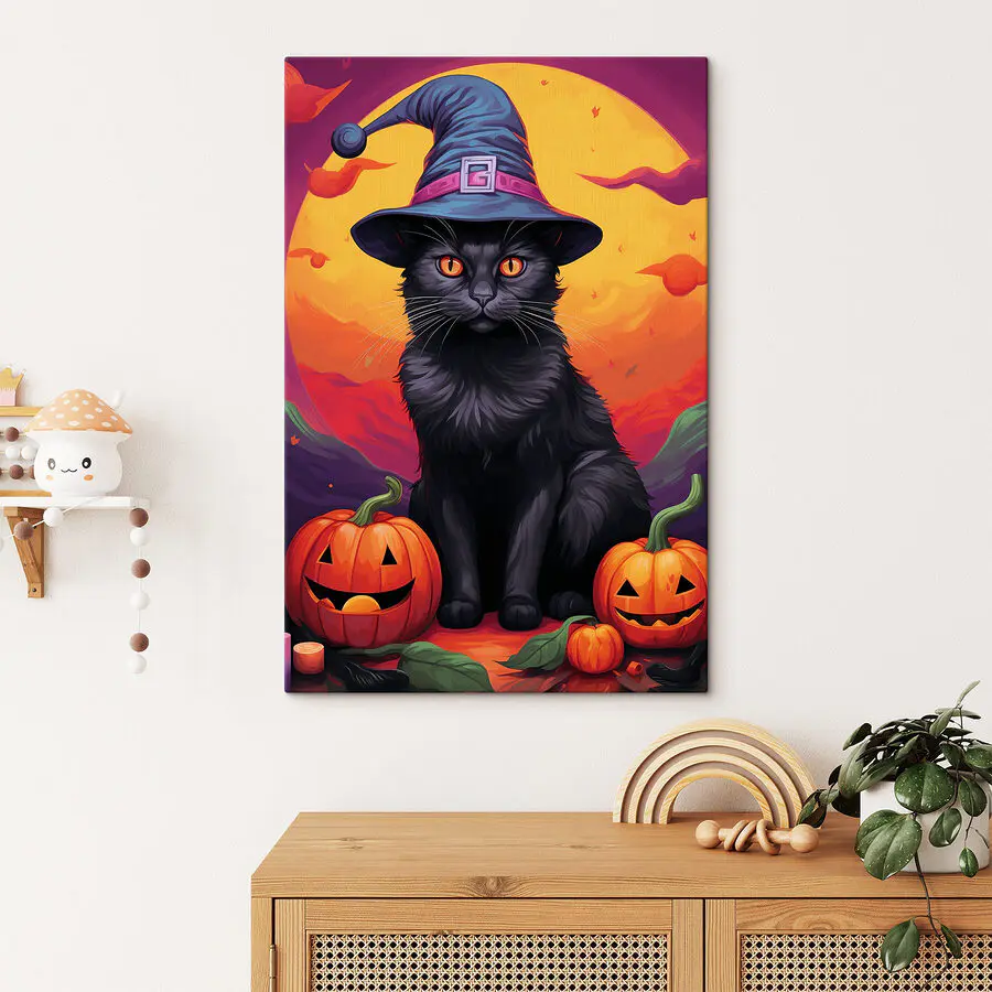 Canvas Schilderijen Zwarte kat met mensenhoed en pompoenen