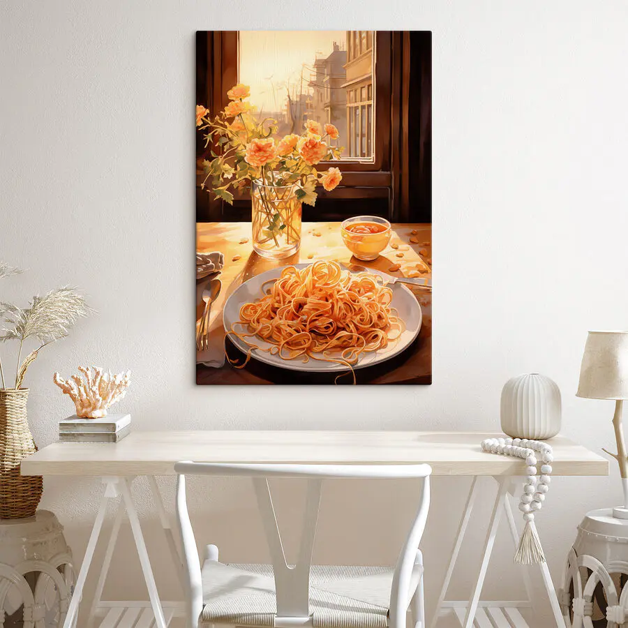 Canvas Schilderijen Bord pasta en een vaas bloemen