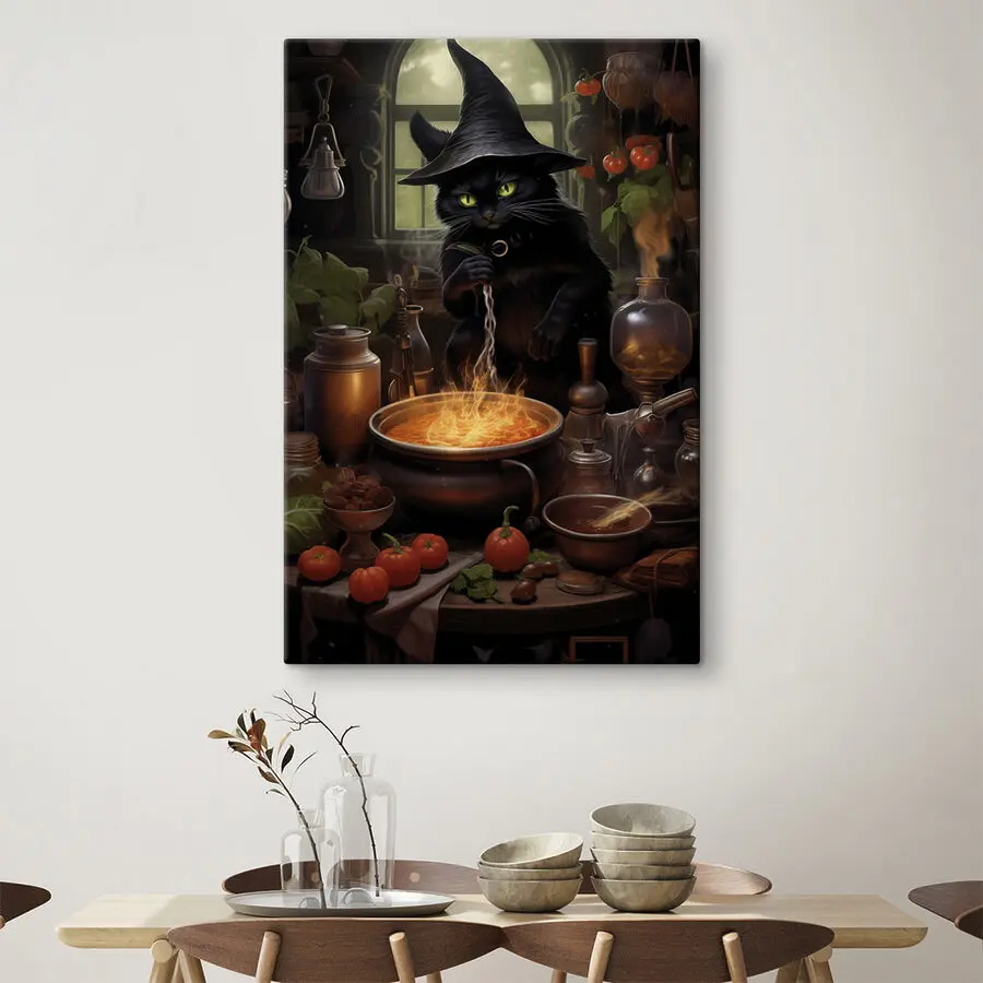 Canvas Schilderijen Kat met mensenhoed die een pot eten kookt