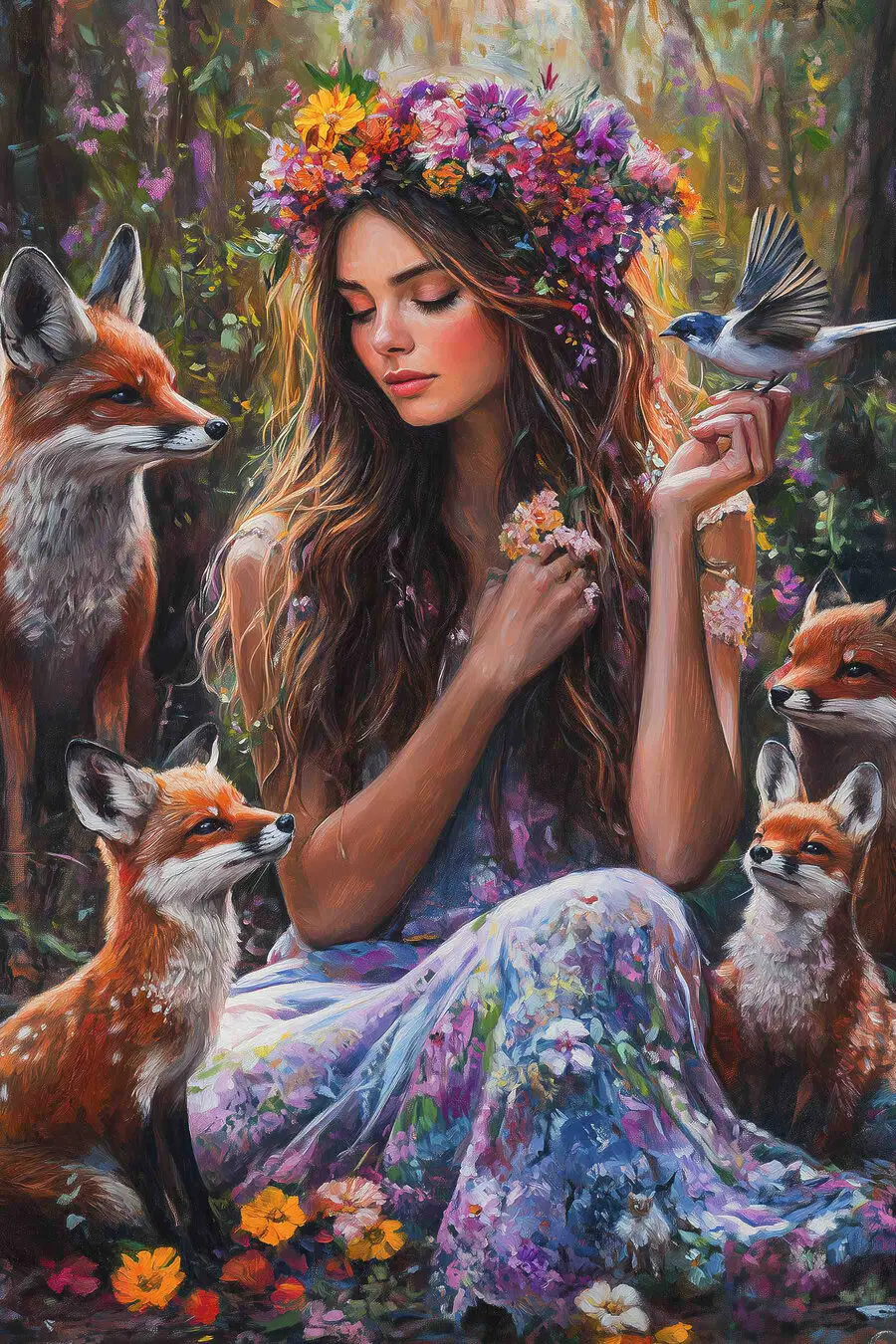 Canvas Schilderijen Schilderij van een vrouw met bloemen en vogels