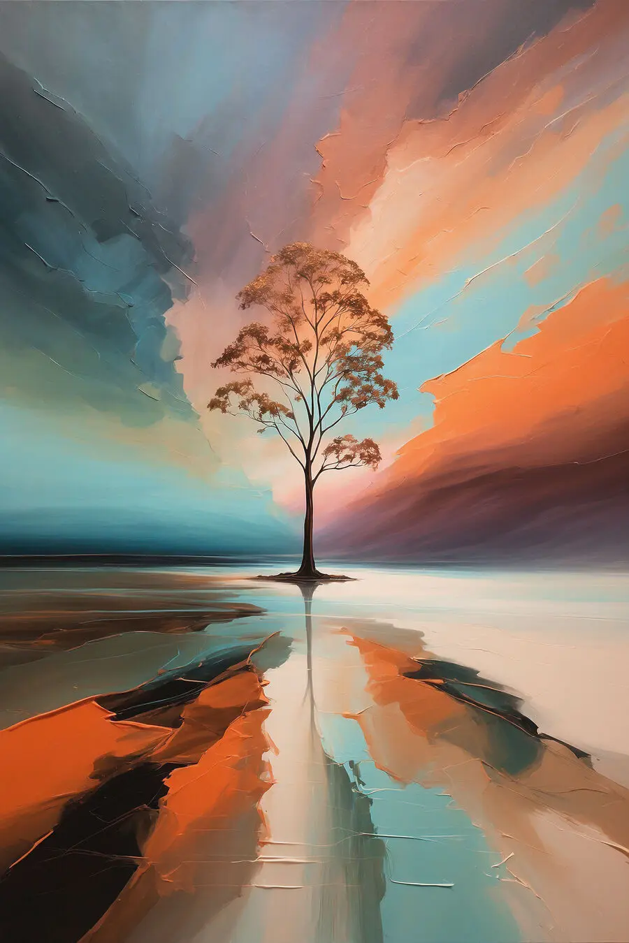 Stel je een vredig meer voor bij zonsondergang, waar een enkele boom hoog oprijst en een zachte reflectie op het water werpt. Deze canvasprint "Tree in the Middle of a Lake" legt dat serene moment prachtig vast. De wervelende kleuren - levendige sinaasappels, kalmerend blauw - roepen een gevoel van rust op, alsof het tafereel iedereen in slaap kan sussen. Het is perfect om een vleugje natuurlijke charme toe te voegen aan een woonkamer of kantoorruimte. Stel je voor dat je op een regenachtige dag, met een kop thee in de hand, naar dit kunstwerk zit te staren en het gevoel hebt dat je in een vredige ontsnapping bent gestapt. Een uitnodiging om adem te halen, te ontspannen en misschien zelfs avontuurlijke verhalen op te roepen over serene meren en eenzame bomen.