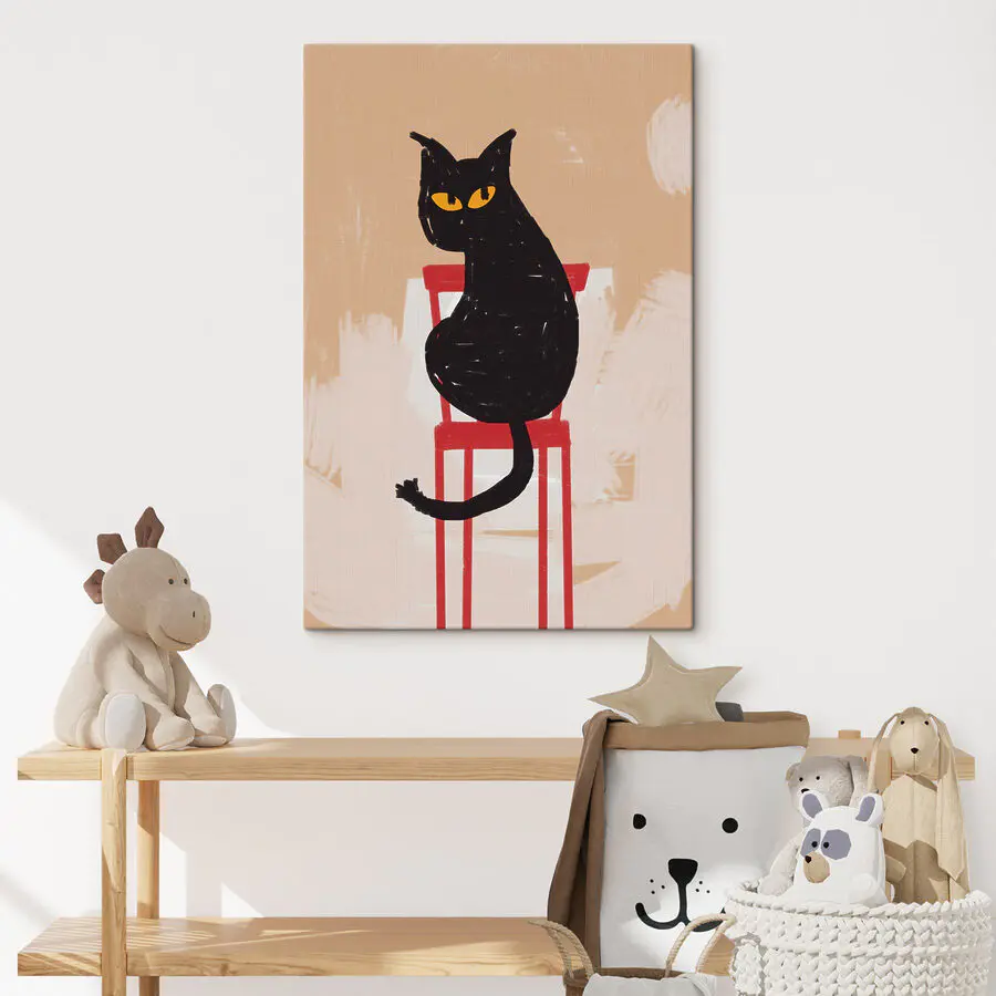 Canvas Schilderijen Zwarte kat zittend op een rode stoel