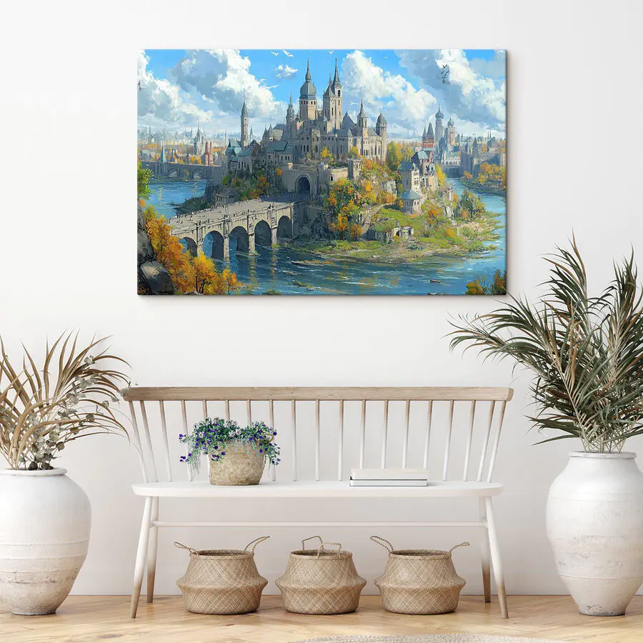 Canvas Schilderijen Kasteel op een heuvel met een brug over water