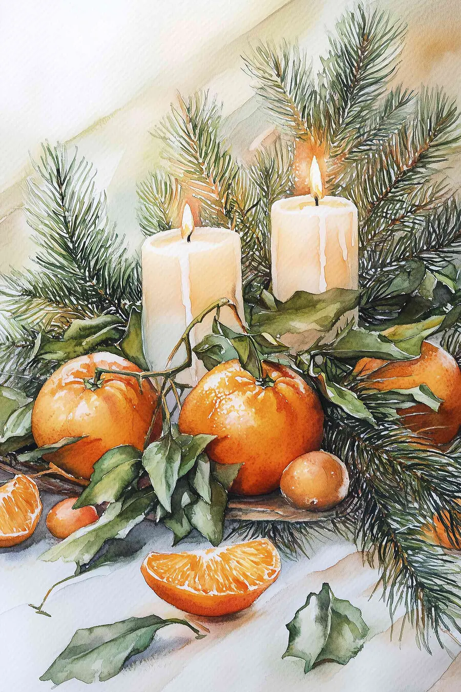 Canvas Schilderijen Aquarel van sinaasappels en kaarsen op een tafel