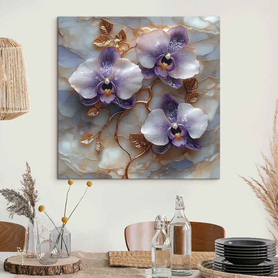 Verander een saaie muur in een dromerige ontsnapping met deze canvasprint met delicate orchideeën tegen een prachtige marmeren achtergrond. Stel je voor dat je een ruimte binnenstapt die zowel sereen als verfijnd aanvoelt, waar deze prachtige bloemen zo van het doek af lijken te bloeien. Het zachte paars en de rijke textuur creëren een rustgevende sfeer die perfect is voor elk hoekje, of het nu een gezellige leeshoek is of een levendige woonkamer. Stel je voor dat je met een kopje thee ligt te staren naar deze schoonheden en alle stress van de dag weg voelt smelten. Het is alsof je een stukje charme van de natuur in huis haalt - wie wil dat nou niet?