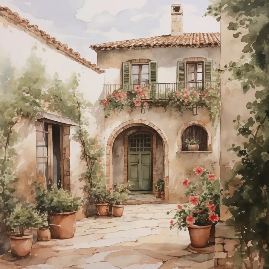 Canvas Schilderijen Schilderij van een huis met potplanten
