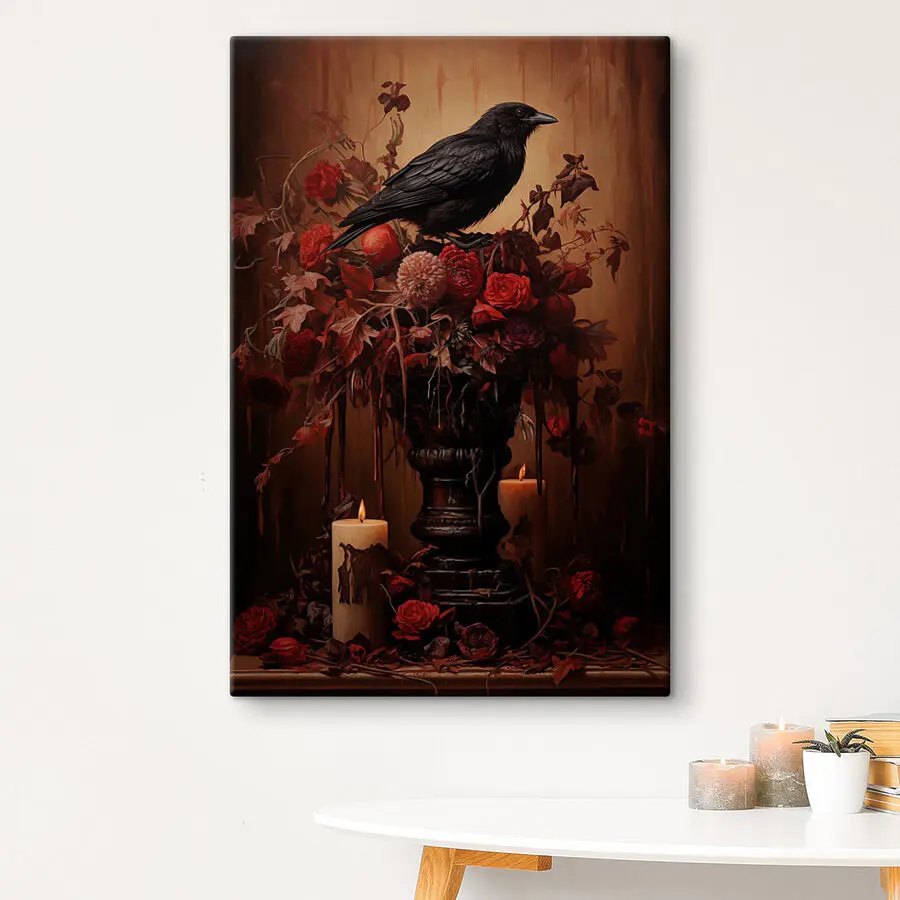 Canvas Schilderijen Zwarte vogel zittend op een vaas met bloemen en kaarsen