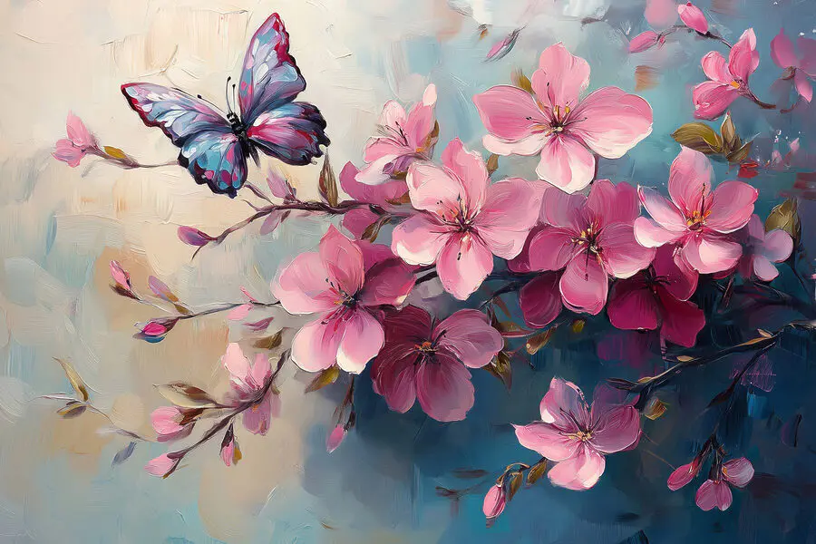 Canvas Schilderijen Vlinder op een tak met roze bloemen