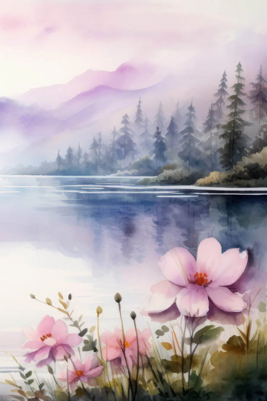 Canvas Schilderijen Aquarel schilderij van bloemen en bomen bij een meer