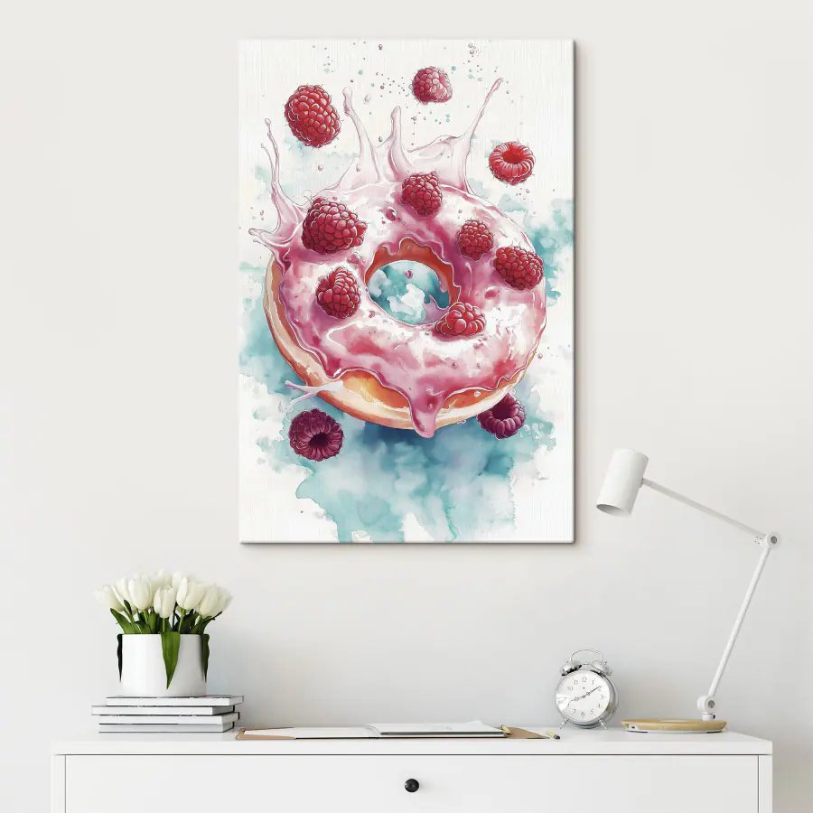 Canvas Schilderijen Schilderij van een donut met frambozen en melkspetters