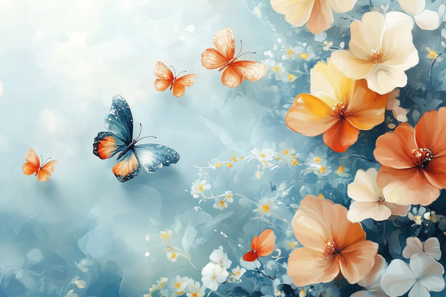 Canvas Schilderijen Vlinders en bloemen op een blauwe achtergrond