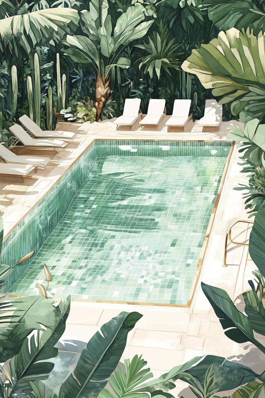 Canvas Schilderijen Zwembad met stoelen en bomen