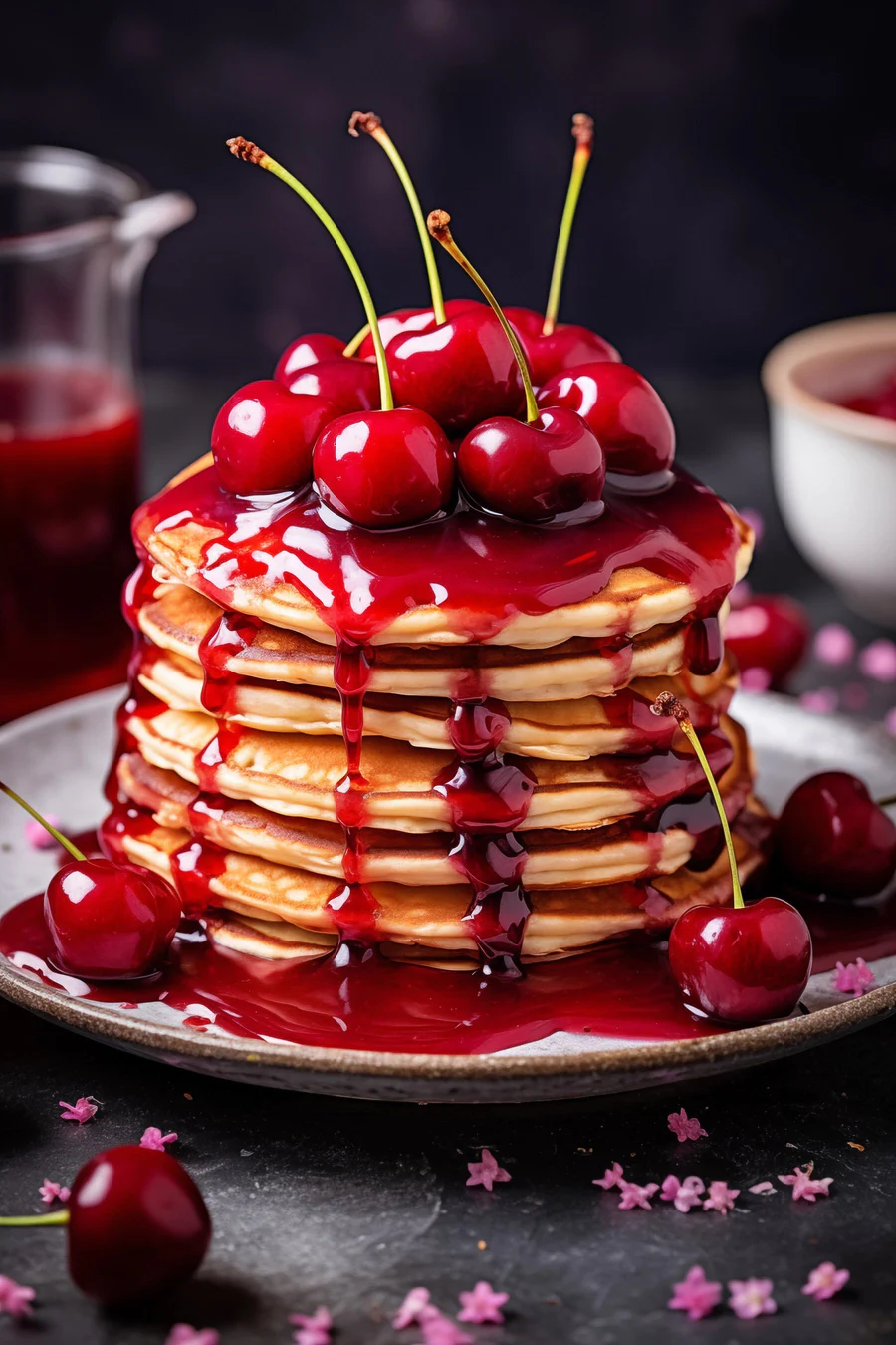 Canvas Schilderijen Stapel pannenkoeken met kersensiroop erop