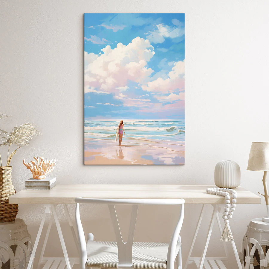 25.01 €15.00 €Canvas Schilderijen Vrouw in badpak met surfplank op strand
