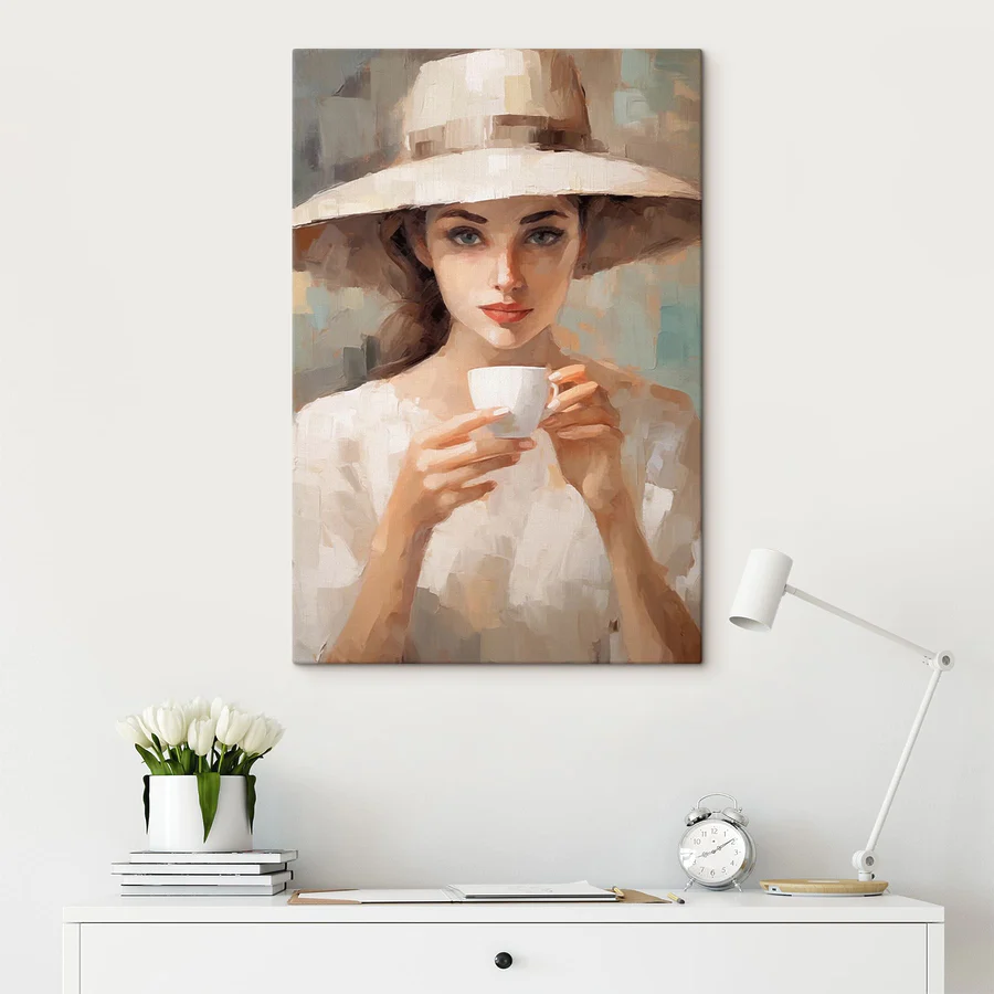 Canvas Schilderijen Vrouw met hoed die een beker vasthoudt