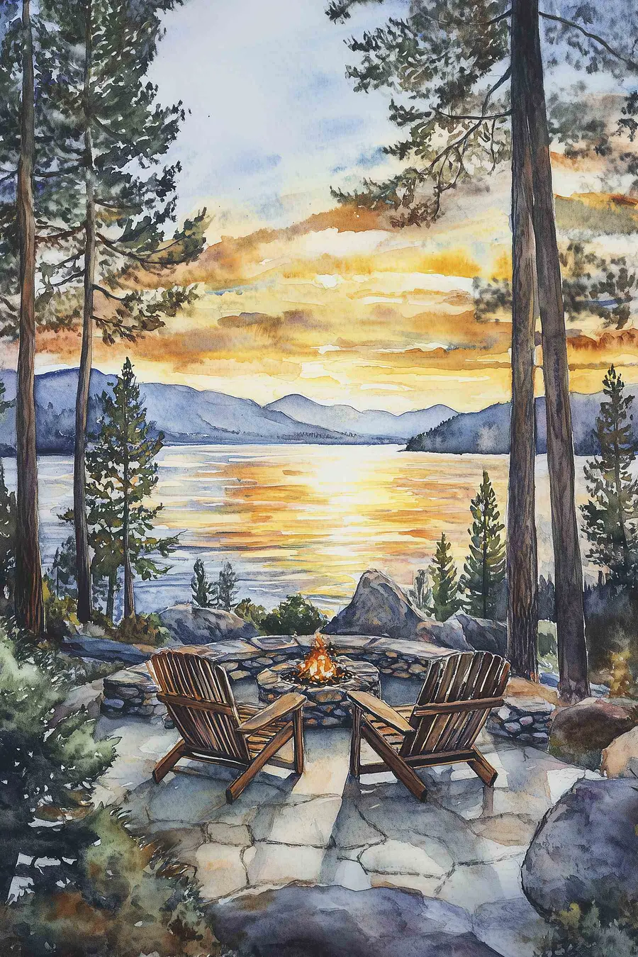 Canvas Schilderijen Aquarel schilderij van stoelen rond een vuurplaats met uitzicht op een meer