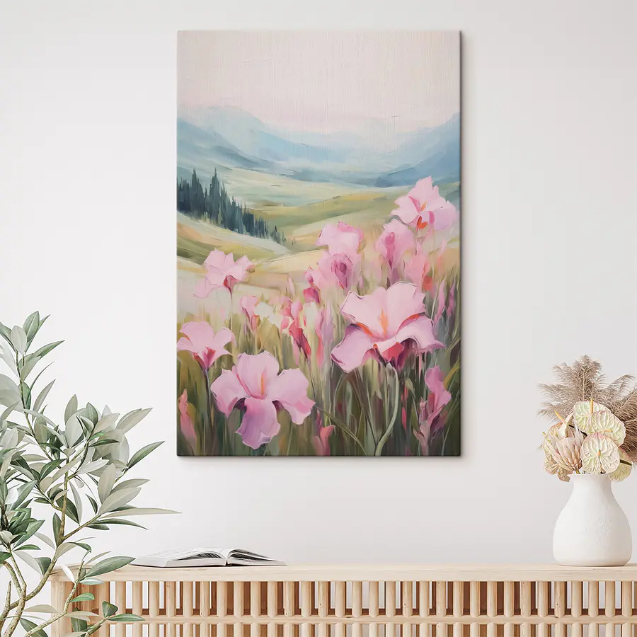 Canvas Schilderijen Schilderij van roze bloemen in een veld