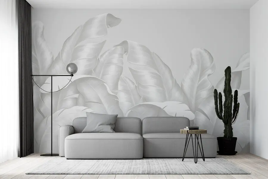 16.31 €9.79 €Fotobehang Witte bladeren op een grijze achtergrond