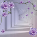 Fotobehang Behang met paarse rozen en een trap