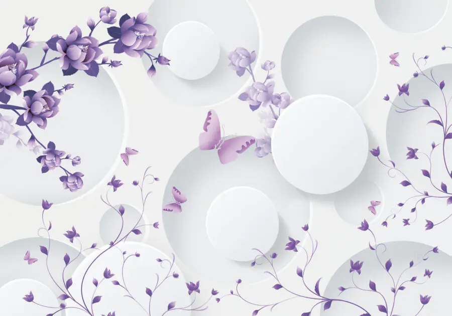 Fotobehang Paarse bloemen en witte cirkels met paarse vlinders