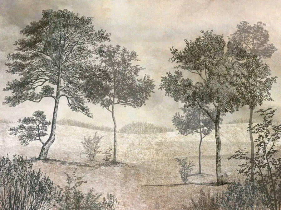 Fotobehang Tekening van bomen in een veld