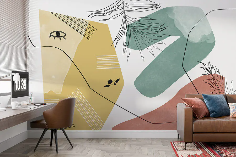 15.51 €9.30 €Fotobehang Een kleurrijk kunstwerk met zwart-witte cirkels en bladeren