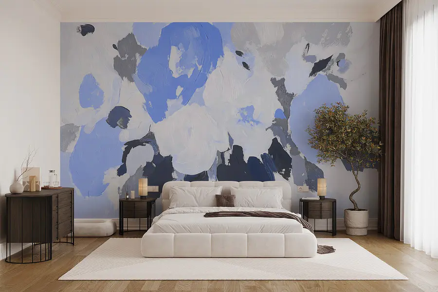 Fotobehang Schilderij van bloemen in blauw en grijs