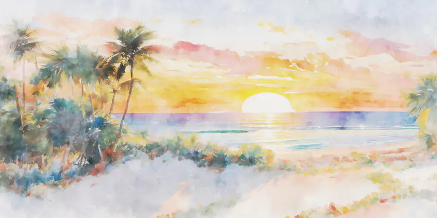 Fotobehang Aquarel van een strand met palmbomen en een zonsondergang