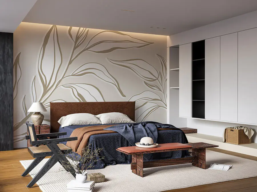 Stel je voor dat je een kamer binnenstapt waar tere bladeren over de muren dansen en verhalen van rust en natuur fluisteren. Deze muurschildering, met zijn zachte, gedempte tinten, nodigt je uit om het wat rustiger aan te doen en wat dieper adem te halen. Het is als een zachte knuffel voor je ruimte - rustig, uitnodigend en verfrissend elegant. Perfect voor gezellige hoekjes of serene slaapkamers, het creëert een achtergrond die harten verwarmt en glimlacht. Stel je voor dat je thee drinkt terwijl je je koestert in de artistieke draai van de schoonheid van de natuur. Dit is niet zomaar behang; het is een verademing voor je huis, waarbij stijl moeiteloos wordt gecombineerd met sereniteit.